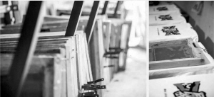 由于愛好搖滾,整個工作室的墻壁上全是各種搖滾樂隊的LOGO,國內的有生命之餅、過失,國外有MONO、Mogwai等等。而這間工作室服務的對象很多就是搖滾樂隊、藝術家,還有設計師,尤其是平面和插畫師,王迪主要是協助這些朋友實現作品的實物化,而工作室的任務就是從事絲網印刷業務,包括紡織品印花、版畫制作,以及一些教學和設計業務。